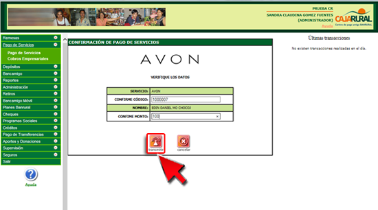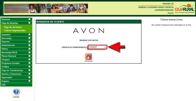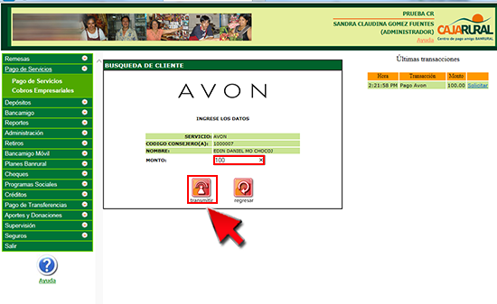 6. Luego que confirme el código de consejera (o) y el monto del cobro AVON, presione el botón "transmitir".