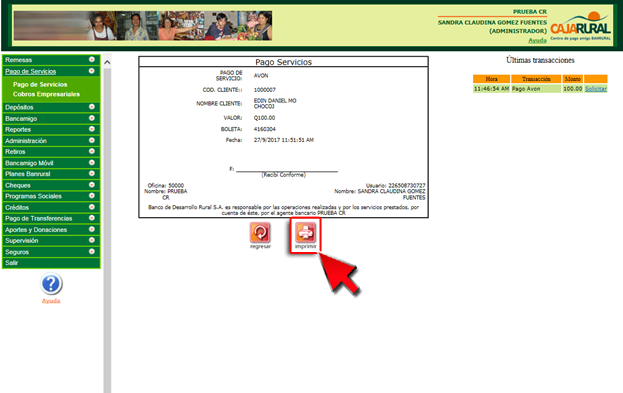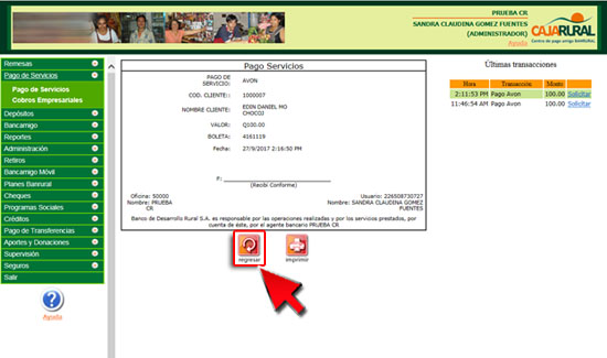 7. Se muestra en la pantalla el comprobante del cobro, presione el botón "Imprimir".
