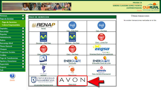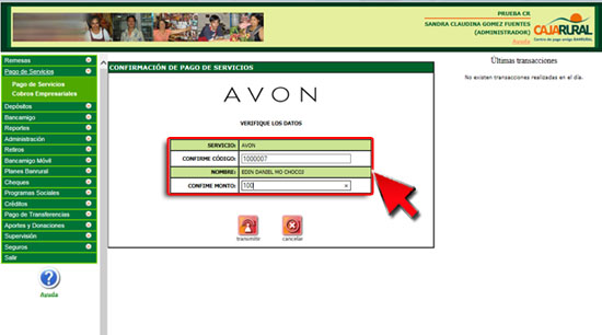 4. Ingrese el monto de cobro AVON en la casilla "monto" y presione el botón "Transmitir".
