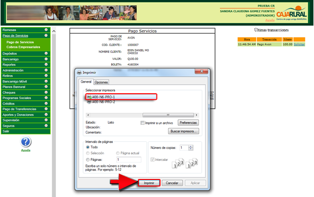 8. Seleccione la impresora que tiene configurada hacia su computadora y presione el botón "Imprimir".