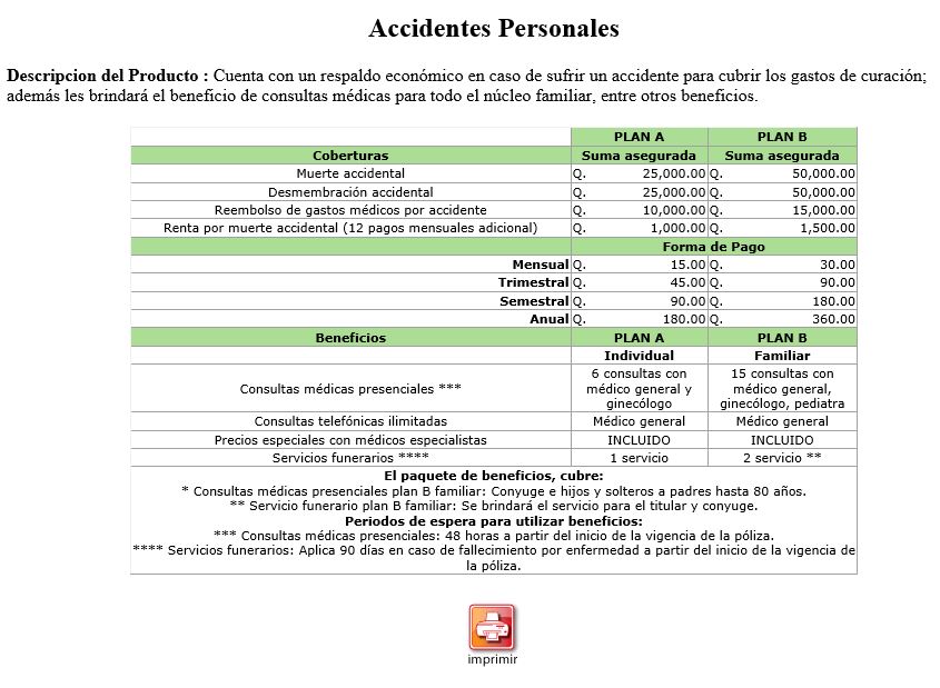 2. Al presionar el botón "Mas Informacion", el sistema desplegará una pantalla con la descripción del producto, la cobertura y el precio. Con el botón "imprimir" puede entregar una copia de la información al cliente en una hoja tamaño carta, con impresora de tinta.