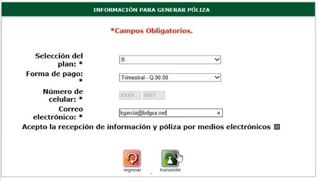 4. El sistema verifica que el cliente tenga entre 18 a 64 años de edad. Si la verificación es exitosa, se muestra esta pantalla donde se debe seleccionar el que plan de seguro que el cliente desea contratar, la forma de pago, y su número de teléfono y correo electrónico, sino estan registrados en el sistema. Luego, seleccione la opción que el cliente "Acepta la recepción y póliza por medios electrónicos". Presione el botón "transmitir" para continuar: