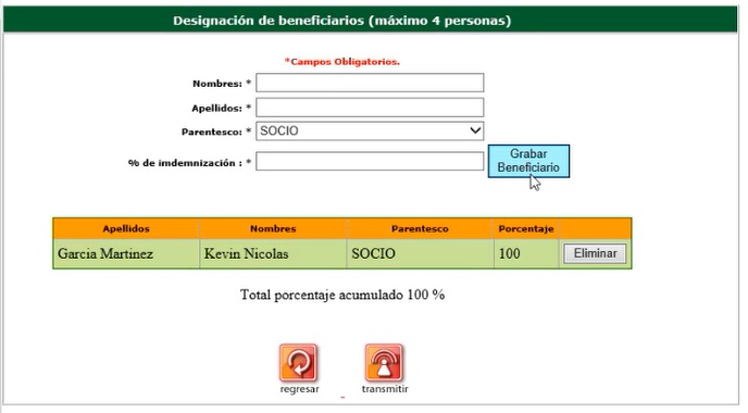 5. A continuación el cliente debe elegir hasta 4 personas para que sean los beneficiarios del seguro por muerte accidental. Debe indicar los nombres, apellidos, parentesco y que porcentaje del beneficio recibirán. Se verifica que el porcentaje de todos los beneficiarios sume el 100%. Cuando este completa la información puede presionar el botoón "transmitir" para continuar.