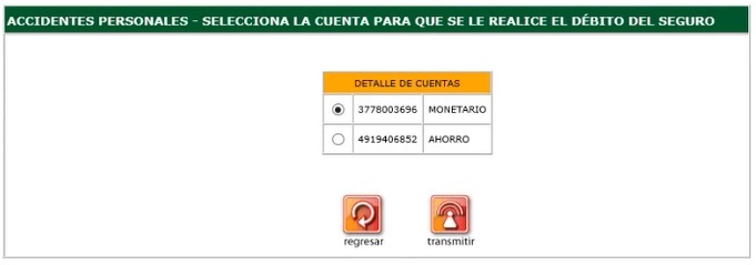 6. En el detalle de cuentas, debe seleccionar la cuenta de la que el cliente autoriza descontar periódicamente para el pago del seguro. Luego presione el botón "transmitir" para continuar.