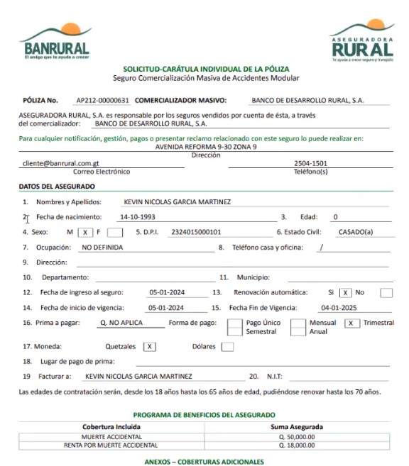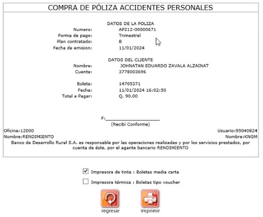 8. La póliza del seguro será enviada por correo electrónico al cliente. Sin embargo, si solicita que se le entregue una póliza impresa, en la misma pantalla de impresión de la boleta. Esta impresión se debe realizar en papel carta, como se muestra a continuación: