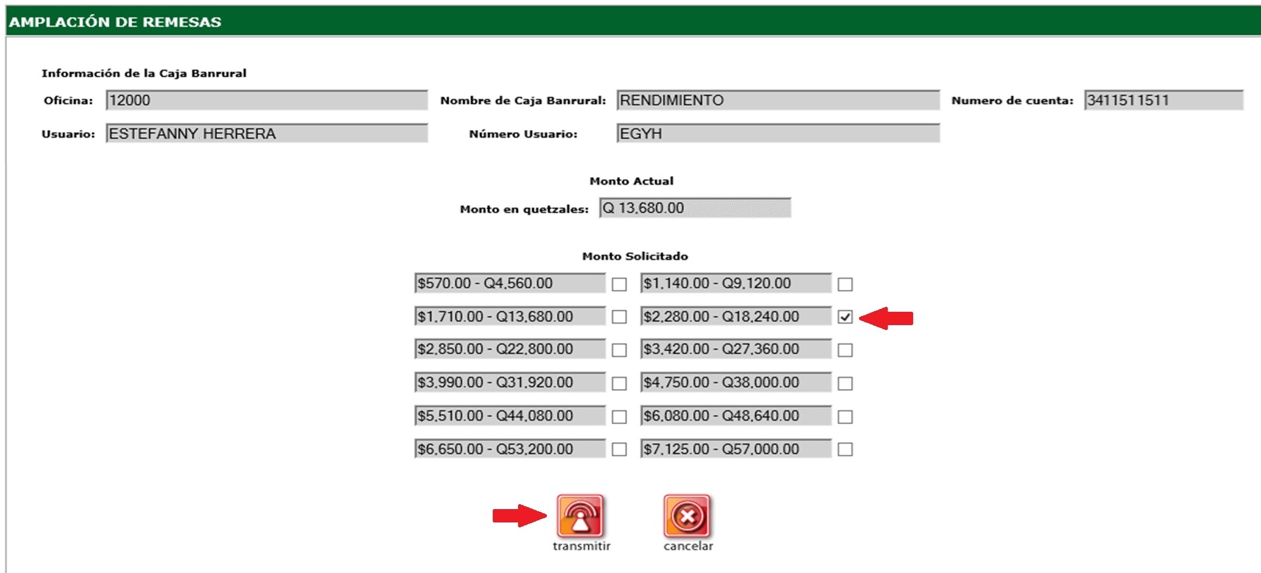 En la pantalla de Ampliación de remesas, hay 3 secciones: Primero se muestra la información de la Caja Banrural, luego el Monto Actual autorizado, en quetzales, y en tercer lugar se puede elegir el nuevo monto que se desea solicitar. Seleccione el nuevo valor que quiere solicitar y presione el botón "transmitir" para continuar.
