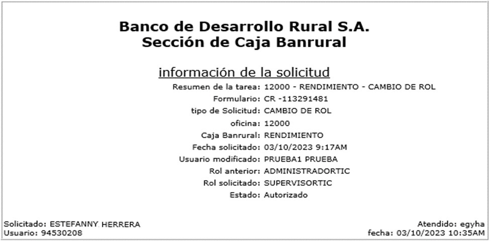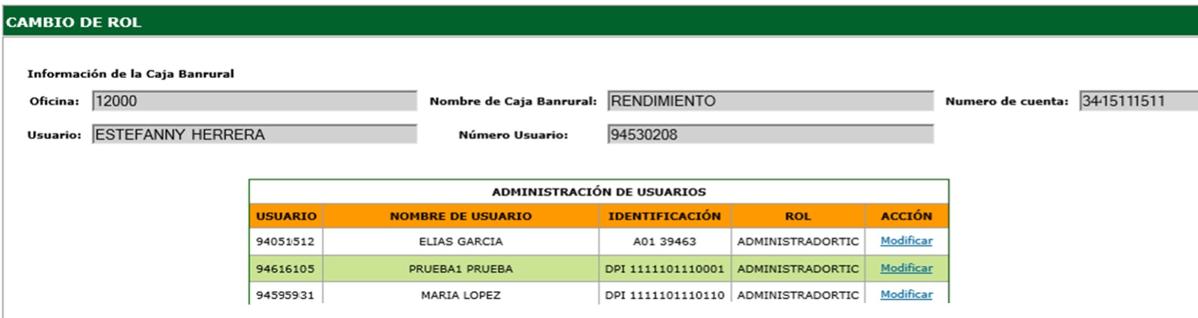 En la pantalla de Cambio de rol, se muestra la información actual de la Caja Banrural, y el listado actual de los usuarios de la caja, con su rol y la acción "Modificar".