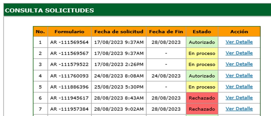Para dar seguimiento a las solicitudes,se puede utilizar la opción "Consulta Solicitudes" en el nuevo menú de Solicitudes. Donde se muestra el listado de las solicitudes, con el número de Formulario que se mostró en la solicitud inicial, la Fecha de solicitud, la Fecha fin, si ya fue procesada, y el Estado actual, que puede ser "En proceso", "Autorizado" y "Rechazado".