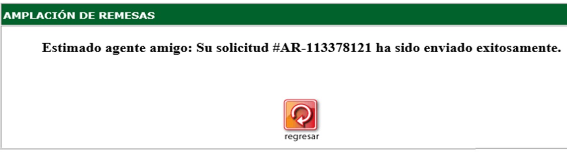 3. A continuación confirme con su huella la petición de Ampliación de remesa, y recibirá una confirmación con el código "AR" y el número de su solicitud.