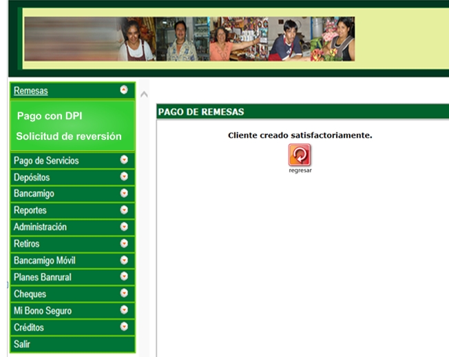 14. El cliente se creará en el sistema, presione el botón "Regresar" para volver a la pantalla de Pago de Remesas.