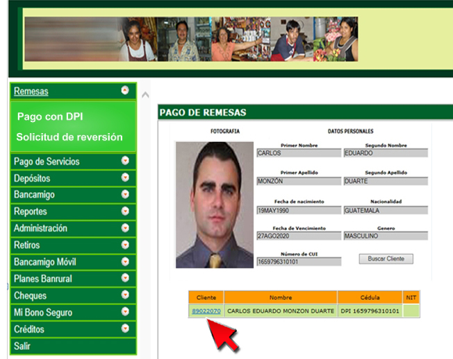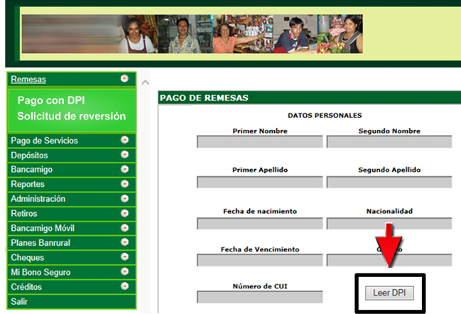 - Solicite el DPI al beneficiario e insértelo en el lector (si el cliente no cuenta con DPI, deberá indicarle que se presente a una agencia BANRURAL a cobrar su remesa).