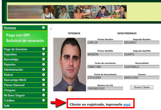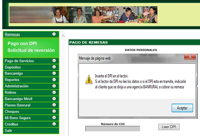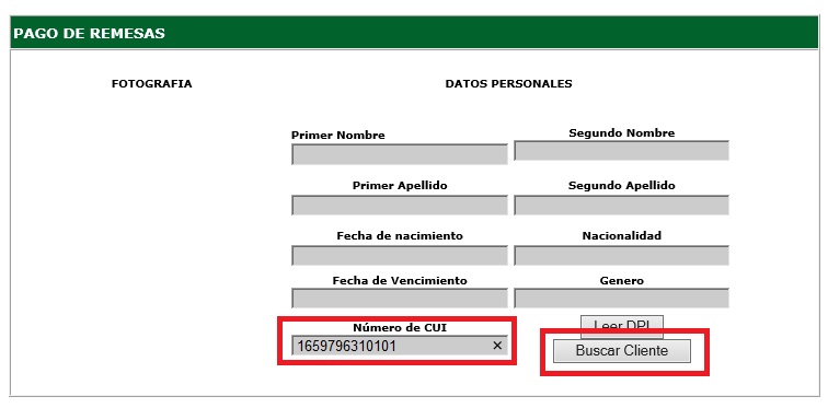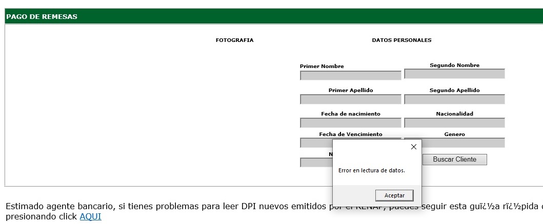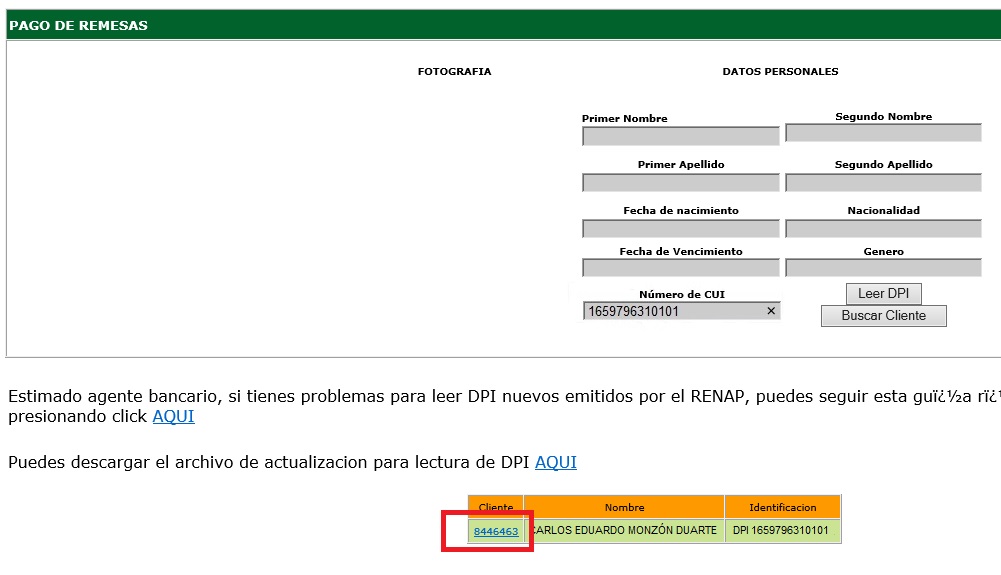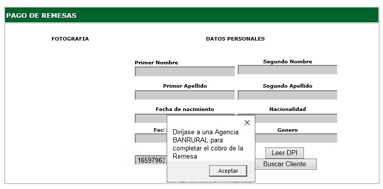 - Si el DPI del cliente se encuentra defectuoso y no puede ser leído por el lector, se habilitará el campo del DPI para que se digite desde el teclado. Si es un cliente activo del Banco podrá continuar con el cobro de la remesa. Si no es cliente del Banco, o solo está registrado con sus datos básicos, le indicará que se dirija a una Agencia BANRURAL.