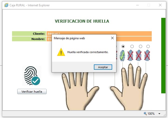 9. Se activará una ventana de confirmación de la huella del cliente. Si se verifica correctamente, continúe con el cobro de la remesa del paso 18