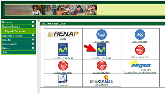 - Puede realizar el pago únicamente de los siguientes servicios: Tigo (Post Pago y Pre Pago); Movistar (Post Pago y Pre Pago); Claro (Linea fija, Claro Post Pago, Claro Pre Pago); EEGSA (Empresa Eléctrica de Guatemala) EMPAGUA y ENERGUATE (Union Fenosa).
