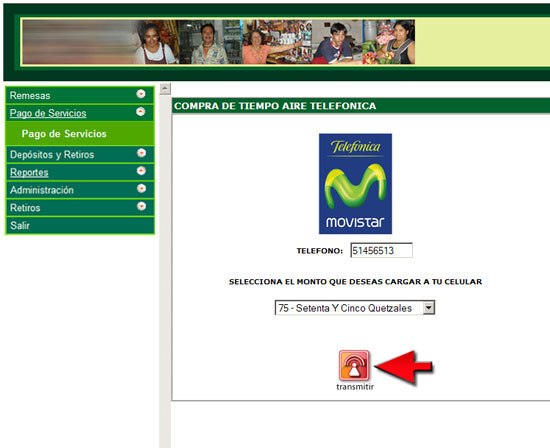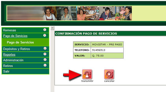 4. Ingrese los datos que se solicitan en la transacción de acuerdo a los datos indicados por el cliente o la factura presentada, luego presione el botón "Transmitir".