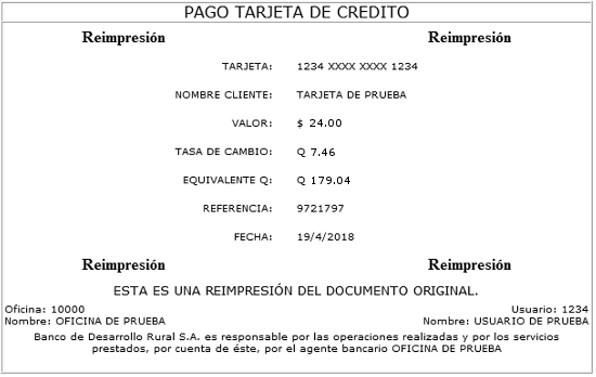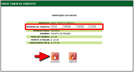 El sistema mostrará los datos del cliente y debes ingresar nuevamente el número de tarjeta de crédito en la casilla <Número de tarjeta>. Luego debes informar al cliente la tasa de cambio preferencial del día y el monto equivalente en quetzales que debe pagar, para finalizar selecciona el botón "Transmitir" para confirmar la transacción.