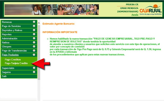 4. Se mostrará la pantalla "Pago tarjeta de crédito", el sistema mostrará las casillas donde debe ingresar el "Número de tarjeta de crédito", seleccionar el tipo de moneda e ingresar el "Monto" que el cliente desea cancelar.