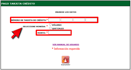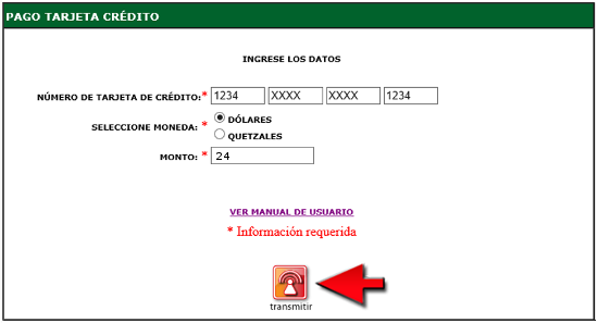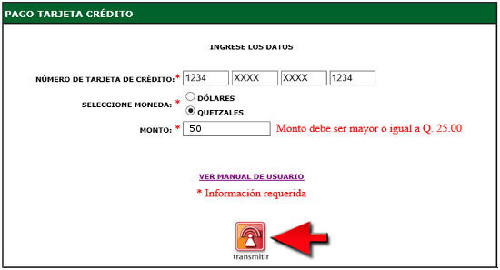 Si seleccionaste el tipo de moneda "Quetzales", unicamente debes ingresar el monto que el cliente desea pagar y a continuación click en el botón transmitir.