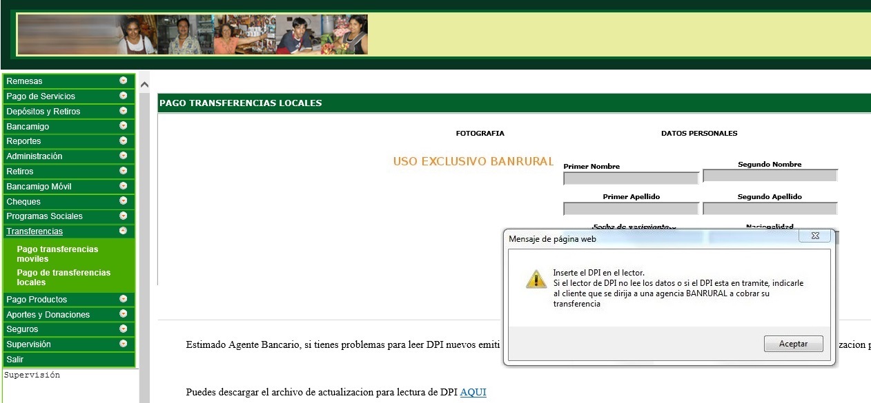 - Solicite el DPI al beneficiario, si el cliente no cuenta con DPI, deberá indicarle que se presente a una agencia BANRURAL a cobrar su Transferencia Local.