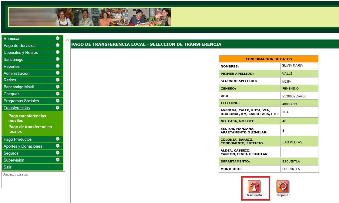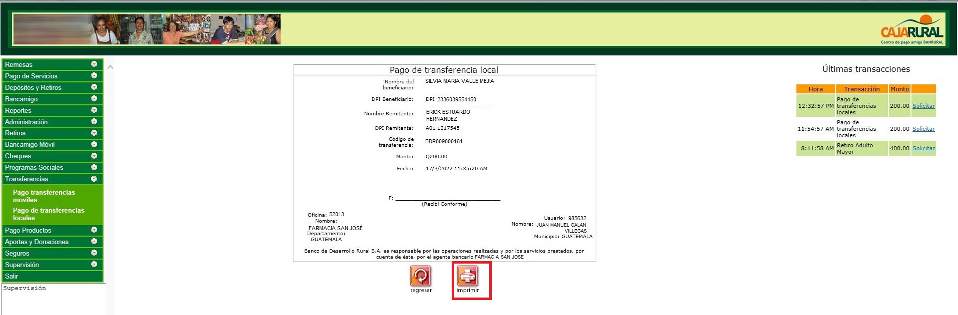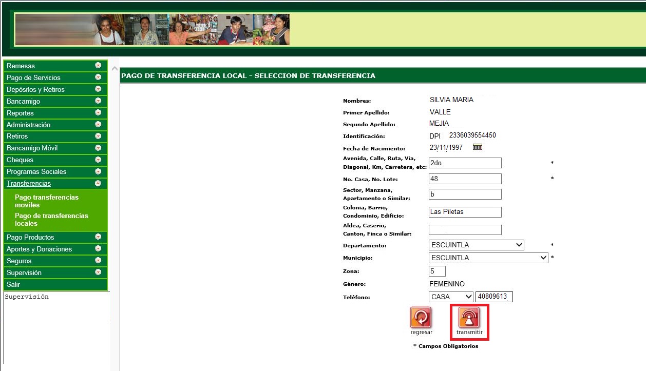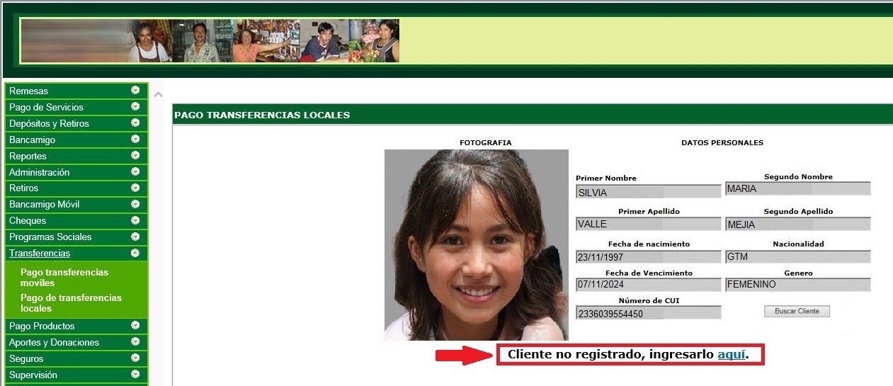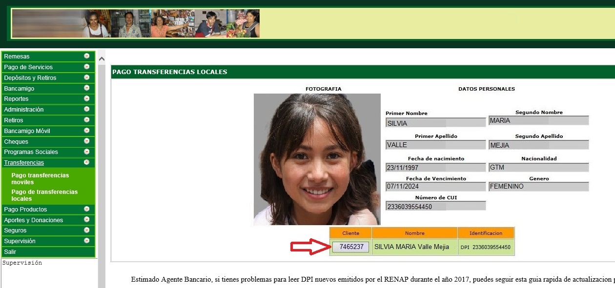 - Verifique que el DPI presentado, realmente pertenezca a la persona que se presenta a cobrar la Transferencia Local. Únicamente el beneficiario indicado en la información de la Transferencia Local puede solicitar el pago.