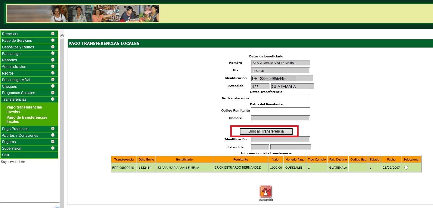 Para buscar por nombre del cliente, presione el botón "Buscar transferencia", y el sistema le mostrará las transferencias disponibles para el cliente: