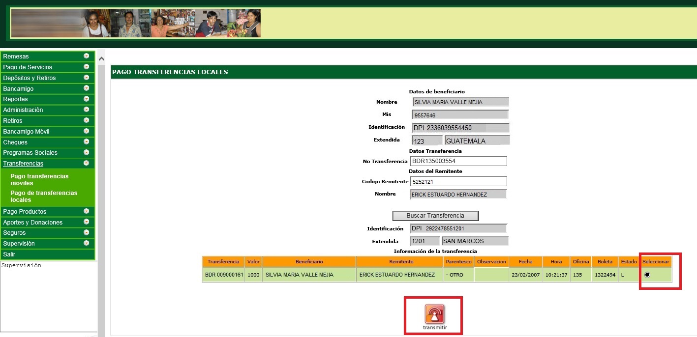 14. El sistema devolverá los datos de la Transferencia Local ingresada, seleccione el botón correspondiente a la Transferencia Local que se va a pagar, y luego presione el botón "Transmitir":