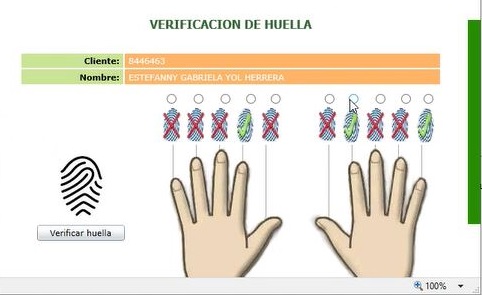 Si existe un error en la lectura del DPI, se habilitará el campo Número de CUI para que se ingrese manualmente. Si el DPI corresponde a un cliente Banrural, deberá confirmar su solicitud con su huella: