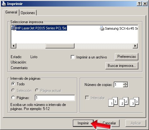 6. Seleccione la impresora que tiene configurada hacia su computadora, luego presione el botón imprimir.