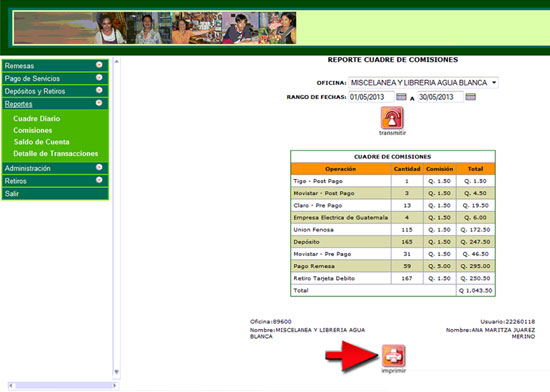 5. El sistema desplegará el reporte de comisiones según la fecha seleccionada, presione el botón "Imprimir".