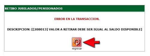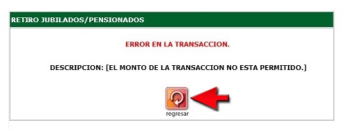 Si el monto solicitado por el cliente es mayor al saldo en la cuenta, el sistema mostrara el siguiente mensaje, luego presione "Regresar para corregir los datos: