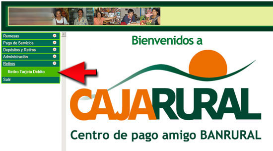 1. Seleccione el menú "Retiros" opción "Retiro Tarjeta Débito".