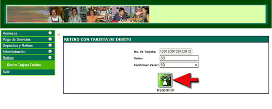 2. Ingrese el número de tarjeta de débito del cliente, el valor por el que desea realizar el retiro y confirme nuevamente el valor. Presione el botón Transmitir.