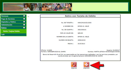 5. El sistema realizará el débito a la cuenta del cliente y se mostrará en pantalla el comprobante de retiro realizado, presione el botón "Imprimir".