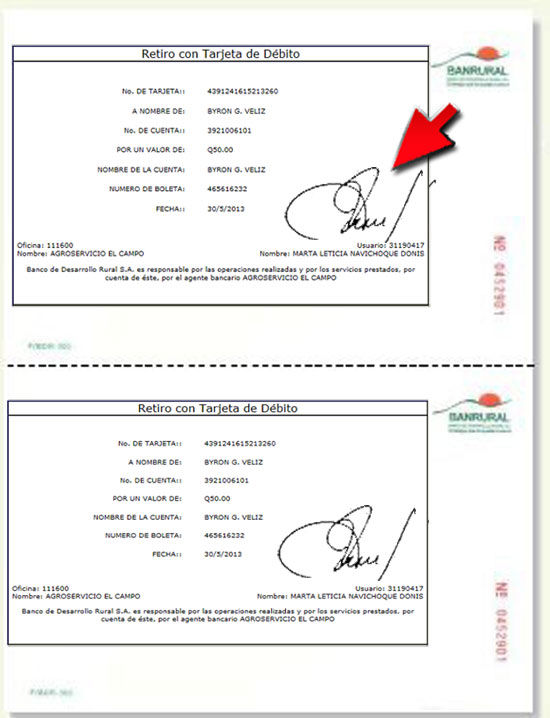 8. Solicite al cliente la firma en ambas partes del comprobante. Entregue una parte del comprobante de retiro y el monto en efectivo al cliente, el otro comprobante reténgalo para su archivo.