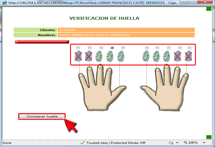 11. Seleccione la huella del cliente que validará la información y posteriormente presione el botón "Comparar huella", si esta es correcta el sistema desplegará el mensaje "Huella verificada correctamente".