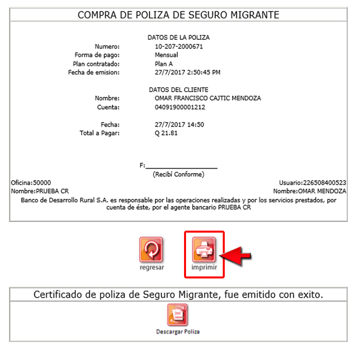 Nota: el Agente Rural podrá reimprimir solo 3 veces la póliza de Seguro Migrante cuando el cliente lo requiera y si esté solicita una cuarta reimpresión, el Agente Bancario deberá referirlo a una Agencia.