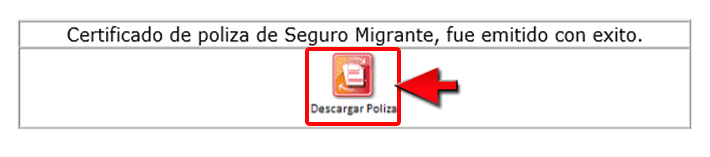 13. Además se visualizará el mensaje "Certificado de póliza de Seguro Migrante, fue emitido con éxito", seleccione la opción "Descarga de póliza".