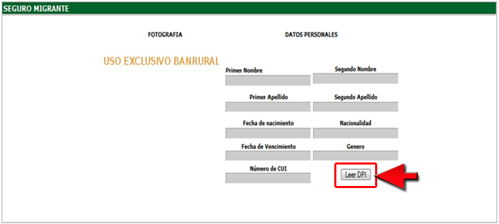 2. El sistema desplegará la pantalla "Seguro Migrante", para realizar la búsqueda del cliente, ingrese el documento de identificación DPI en el lector y presione el botón "Leer DPI".