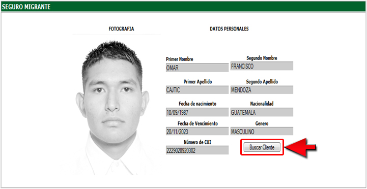 4. El sistema desplegará los datos leídos en el documento de identificación, presione el botón "Buscar Cliente".