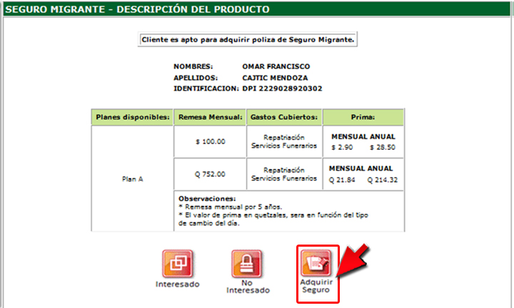 Nota: para el caso donde el cliente no cumple con lo requerido, el sistema desplegará el siguiente mensaje "El cliente no cumple con los requisitos para adquirir el Seguro Migrante".