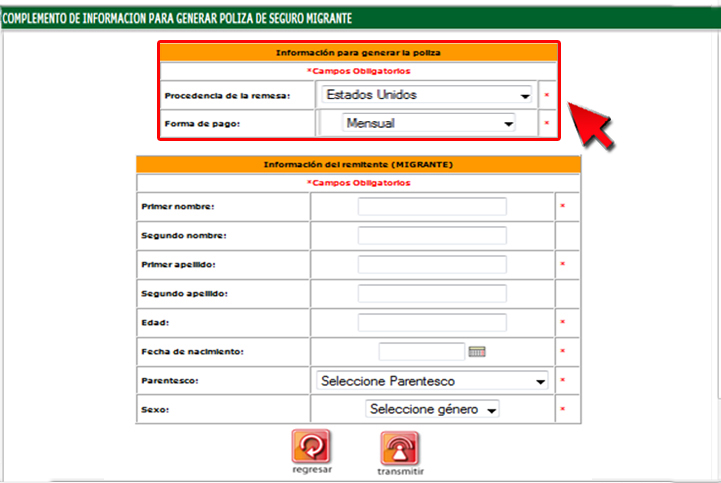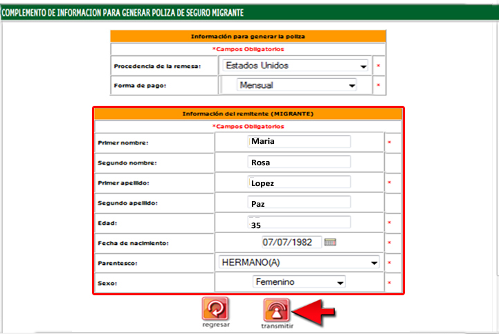 8. En el apartado "Información del remitente (Migrante)" ingrese la información del cliente al que se le adjudicará el seguro y presione el botón "Transmitir".