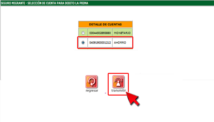 9. El sistema desplegará la pantalla "Detalle de cuentas" en la que deberá seleccionar la cuenta en la cual se realizará el débito para el pago de la prima de Seguro Migrante.