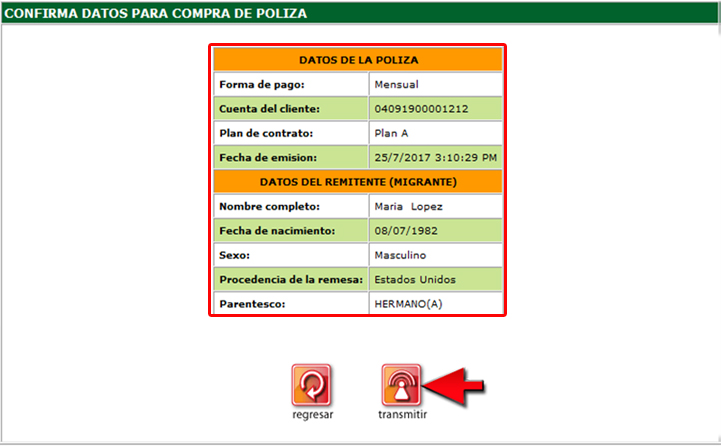 10. En la pantalla "Confirmar datos para compra de póliza", verifique que los datos de la póliza y la información que se ingresó del remitente (Migrante) sean correctos.