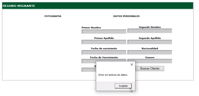 3. Si hay un error en la lectura del DPI, se mostrará el mensaje de "Error en la lectura de datos." Además se activará el campo de DPI para que se pueda ingresar manualmente.