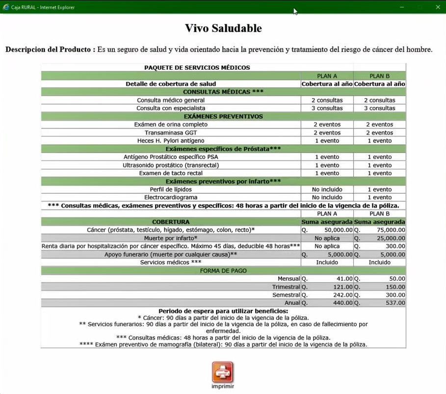 2. Al presionar el botón "Mas Informacion", el sistema desplegará una pantalla con la descripción del producto, la cobertura y el precio. Con el botón "imprimir" puede entregar una copia de la información al cliente en una hoja tamaño carta, con impresora de tinta.