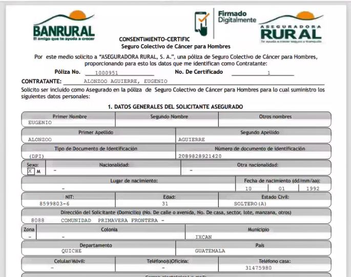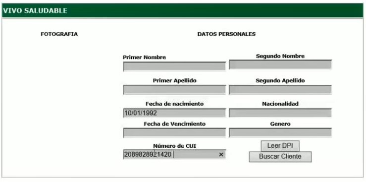 3. Para iniciar con la venta de un Seguro Vivo Saludable, seleccione el botón "Solicitar". Inserte el DPI en el lector y presione el botón "Leer DPI". Si hay un error en la lectura del DPI, se mostrará el mensaje de "Error en la lectura de datos." Además se activarán; los campos de Fecha de nacimiento y Número de CUI para que se pueda ingresar manualmente.