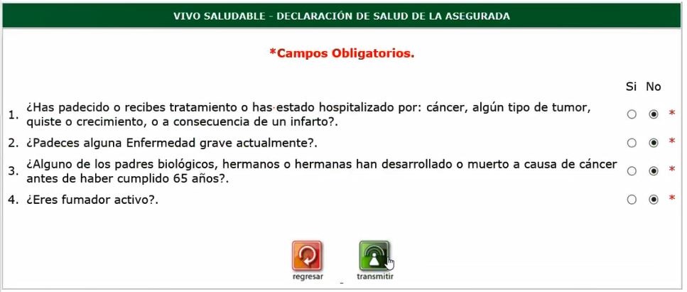 5. . Si el cliente responde afirmativamente a la pregunta de fumador activo, aparecerán 3 nuevas preguntas que debe responder, para confirmar que puede optar al seguro Vivo Saludable. Una vez conteste las preguntas, presione el botón "transmitir" para continuar:
