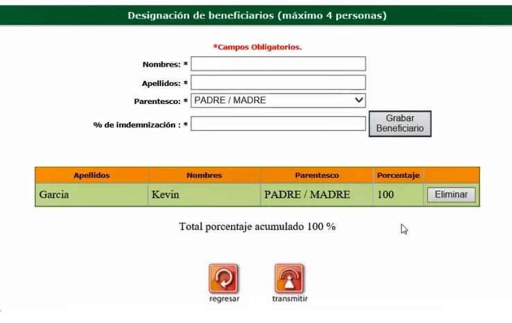 7. A continuación el cliente debe elegir hasta 4 personas para que sean los beneficiarios del seguro, para que reciban el apoyo funerario. Debe indicar los nombres, apellidos, parentesco y que porcentaje del beneficio recibirán. Se verifica que el porcentaje de todos los beneficiarios sume el 100%. Cuando este completa la información puede presionar el botoón "transmitir" para continuar.