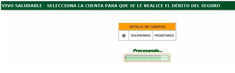 8. En detalle de cuentas, debe seleccionar la cuenta de la que el cliente autoriza descontar periódicamente para el pago del seguro. Luego presione el botón "transmitir" para continuar.