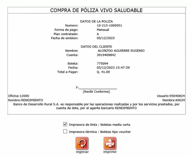 10. La póliza del seguro será enviada por correo electrónico al cliente. Sin embargo, si solicita que se le entregue una póliza impresa, en la misma pantalla de impresión de la boleta se puede solicitar la impresión de la póliza. Esta impresión se debe realizar en papel carta, tal como se muestra a continuación: